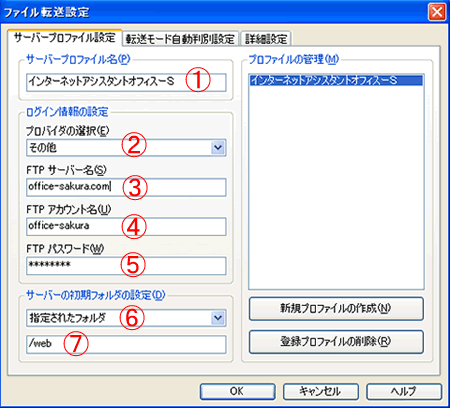 1. サーバープロファイル名はお好きな名前を記入して下さい。 2. プロバイダの選択は「その他」をお選び下さい。 3. FTPサーバー名は「http://www.office-sakura.com」の「office-sakura.com」を記入。 上記ドメイン名を、お客様のドメイン名に変更してください。 ※ドメインで接続できるまでは、設定時にお伝えしたIPアドレス(例123.456.789.123) 4. FTPアカウント名は設定完了時にお送りした「ユーザー名」を記入 。 5. FTPパスワードはサーバー設定完了時にお送りした「パスワード」を記入。 6. 選択肢の中から「指定されたフォルダ」をお選び下さい。 7. 表示は必ず「/web」に設定して下さい。 |